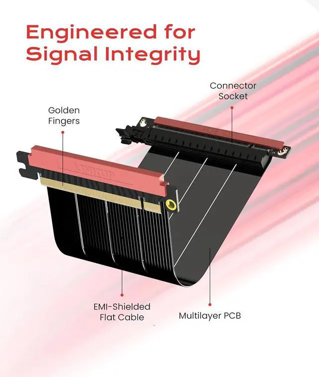 Gen5 x16 Performance & Shielding Delivers full 128GB/s on PCIe 5.0 x16 with tuned impedance, premium conductors, and multilayer shielding to suppress crosstalk and EMI. The AVA design targets clean eye margins under load and tight bends, making it a dependable PCIe Gen5 riser cable for high-FPS gaming, AI, and storage workflows. Replace Gen 3 and Gen 4 PCIe cables while preserving upgrade headroom for future GPUs.