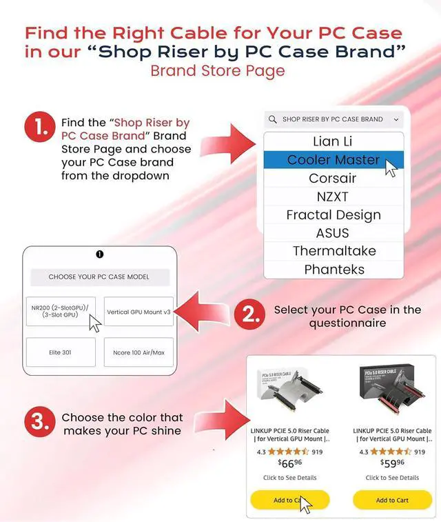 Choose the right Cable Choose a length between 235.4 inches (see Installation Instruction) and the connector you need: right angle, straight, left angle, double reverse, single reverse right, single reverse left, or single reverse straight. One family covers ITX sandwiches, server trays, and vertical displays. Consistent Gen5 signal integrity across sizes makes it a flexible PCIe extender or GPU riser cable for clean cable management today with room to evolve tomorrow.