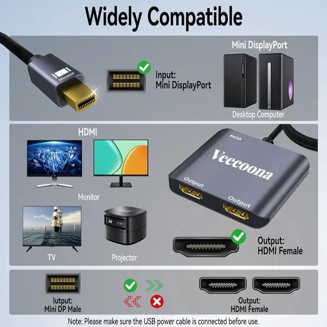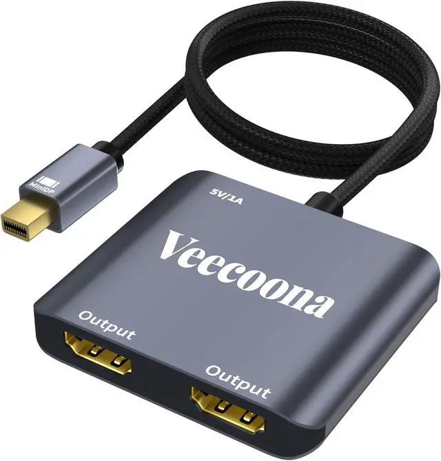 Plug and PlayFeaturing a hassle-free setup, this HDMI splitter for extended display works instantly. Here's how to use it: 1. Connect it to your display with a 4K@60Hz HDMI cable. 2. Power it via USB if needed. 3. Plug the Mini DP connector into your PC's Mini DisplayPort(Thunderbolt 1/2).