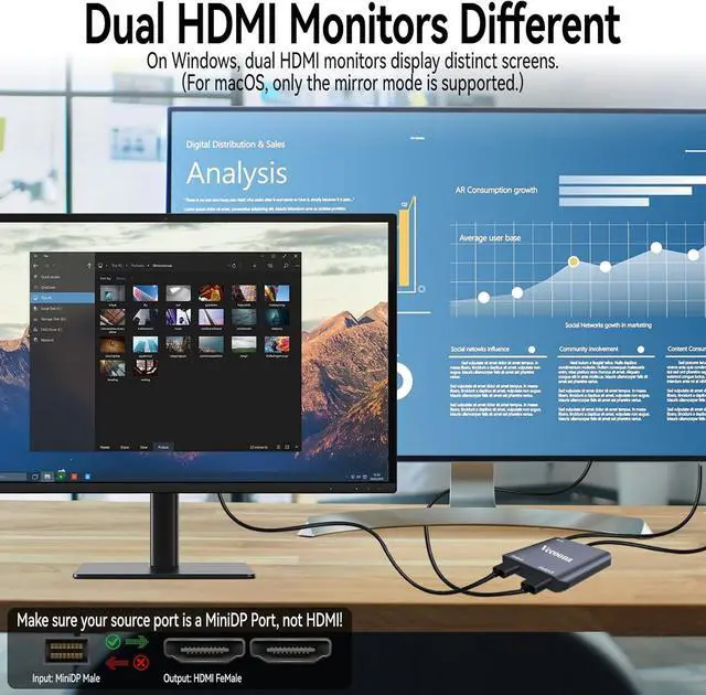 Mini DisplayPort to Dual HDMI AdapterWith a Mini DP to dual HDMI adapter, this adapter enables extended display on dual monitors for Windows PCs, supporting both SST and MST modes. Note: macOS only supports screen mirroring (no extended mode).