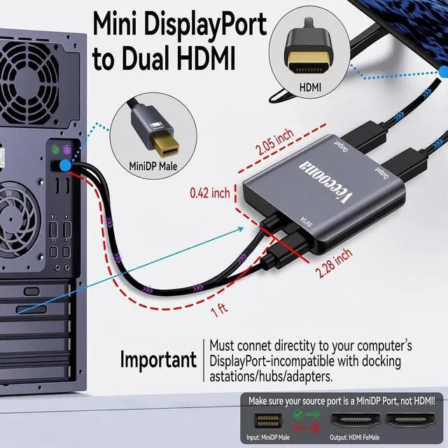 4K60Hz Ultra HDThis hdmi splitter for dual monitors delivers stunning 4K@60Hz resolution on a single display or 4K@30Hz when extending to dual monitors. Fully backward compatible with 2K/1080P/720P resolutions. Important: Must connect directly to your computer's Mini DisplayPort - not compatible with docking stations/hubs/adapters.