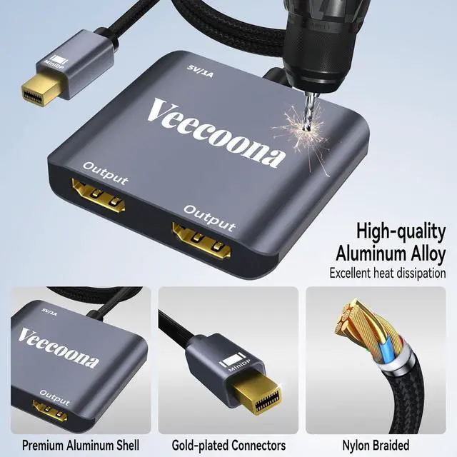 Premium Aluminum HousingBuilt with a durable aluminum alloy casing, this Mini DisplayPort/Thunderbolt 2 to Dual HDMI Splitter resists scratches, fingerprints, and overheating, making it perfect for travel, office, or home use. If any issues arise, our 18/7 customer support team guarantees a quick resolution.