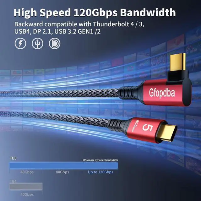 80Gbps Data Transfer: USB 4 2.0 cable for Thunderbolt 5 cable right angle offers transfer speeds of up to 80Gbps, allowing you to transfer large files and stream high-resolution content in seconds. With a whopping 120Gbps of video bandwidth, this cable ensures flawless video streaming