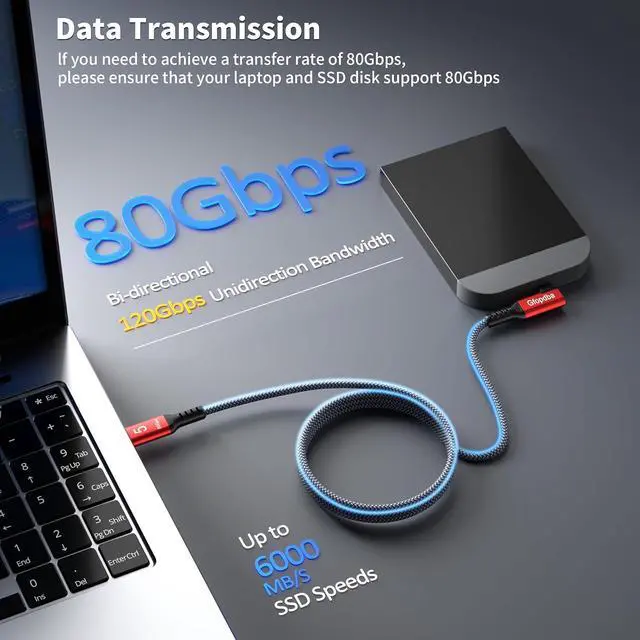 Upgrade this high-performance 120Gbps bandwidth USB4 2.0 cord for right angle Thunderbolt 5 cable today. If you have any issues with the USB 4 2.0 cable, we will provide you with a satisfactory solution. If you need to achieve a transfer rate of 80Gbps, please ensure that your laptop and SSD disk support 80Gbps