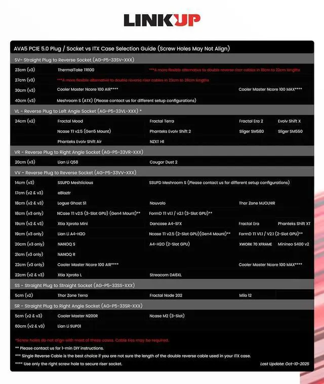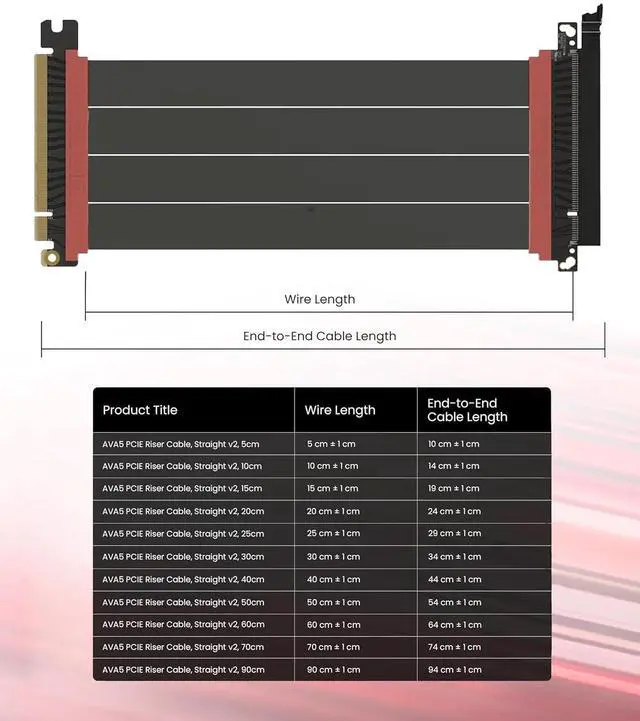 Choose the right Cable Choose a length between 235.4 inches (see Installation Instruction) and the connector you need: right angle, straight, left angle, double reverse, single reverse right, single reverse left, or single reverse straight. One family covers ITX sandwiches, server trays, and vertical displays. Consistent Gen5 signal integrity across sizes makes it a flexible PCIe extender or GPU riser cable for clean cable management today with room to evolve tomorrow.