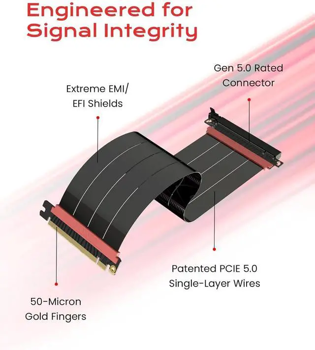Gen5 x16 Performance & Shielding Delivers full 128GB/s on PCIe 5.0 x16 with tuned impedance, premium conductors, and multilayer shielding to suppress crosstalk and EMI. The AVA design targets clean eye margins under load and tight bends, making it a dependable PCIe Gen5 riser cable for high-FPS gaming, AI, and storage workflows. Replace Gen 3 and Gen 4 PCIe cables while preserving upgrade headroom for future GPUs.