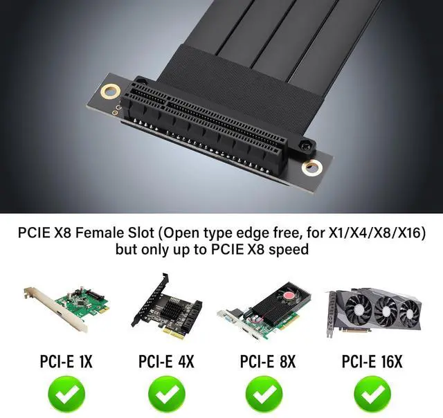 PCIe X8 FemalePCIe X8 female socket allows installation of PCIe X1/X4/X8/X16 adapters, but only up to PCIe X8 speeds.