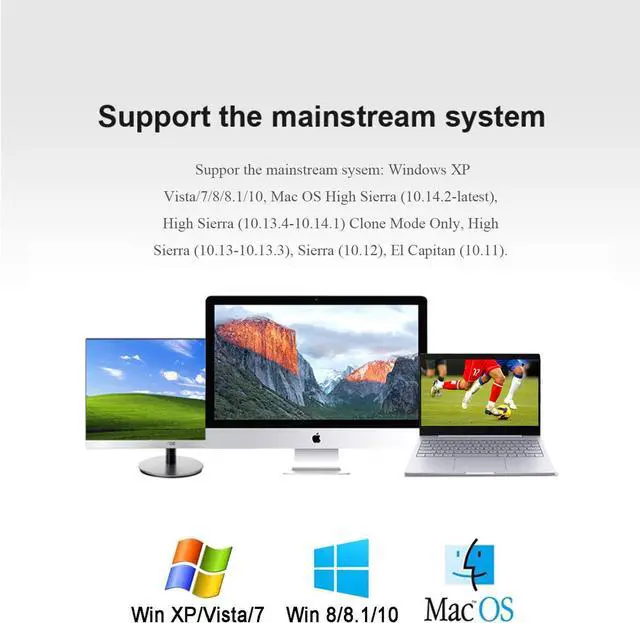 Wide CompatibilityCompatible with Mac OS High Sierra (10.14.2-latest), High Sierra (10.13.4-10.14.1) Clone Mode Only, High Sierra (10.13-10.13.3), Sierra (10.12), El Capitan (10.11), Windows 11/10/8.1/8/7. Not support macOS Monterey 12 or above/Chromebook/Linux/Android.