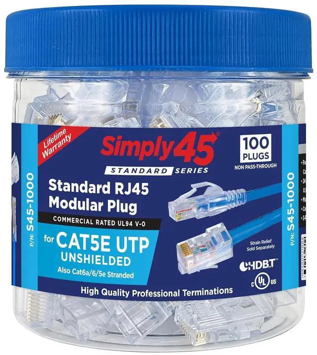 Single Piece Design - The S45-1000 is a single-piece unshielded Standard WE/SS RJ45 modular plug for use with unshielded LAN cables. No-load bar required.