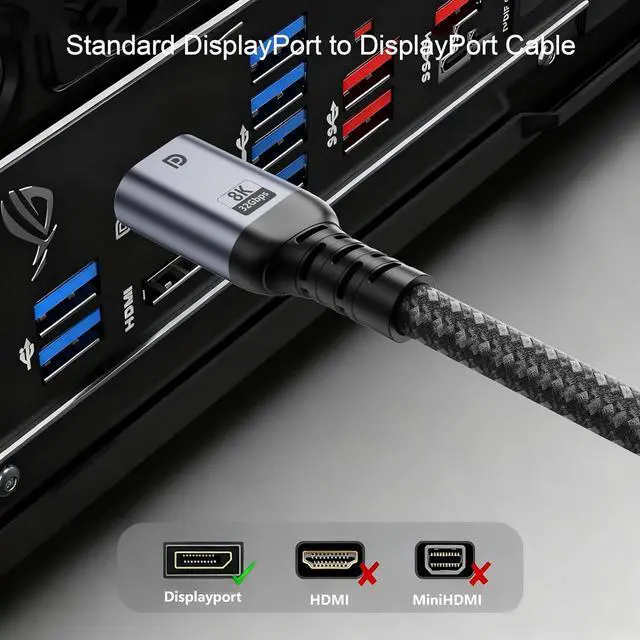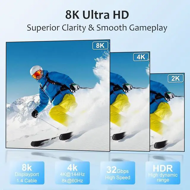Uncompromised 8K Performance at Ultimate LengthDefying the limitations of standard cables, our 40ft dp cable variant is precision-engineered to maintain the critical 32.4Gbps (HBR3) bandwidth over its entire run. It guarantees a rock-solid, lossless signal for true 8K@60Hz and 4K@120Hz, Supports 8K@60Hz, 5K@60Hz, 4K@144Hz, 2K@240Hz, 1080P@240Hz+ resolutionand HDCP 2.2, HDCP 1.4, HDR; Backwards compatible with DisplayPort 1.3/1.2/1.1, eliminating the signal degradation and dropouts common in inferior long cables