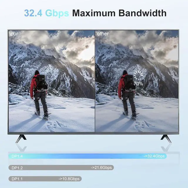 32.4Gbps High Bandwidth SpeedOur displayport to displayport cable can provide 240Hz refresh rate, HBR3 support 32.4Gbps bandwidth. The high refresh rate and high resolution give you an excellent gaming experience with no motion blur, screen tears or flickers, our cable delivers every pixel and frame without compression or data loss. Perfect for high-end gaming, 8K video editing, and professional graphic work where flawless image integrity is non-negotiable.