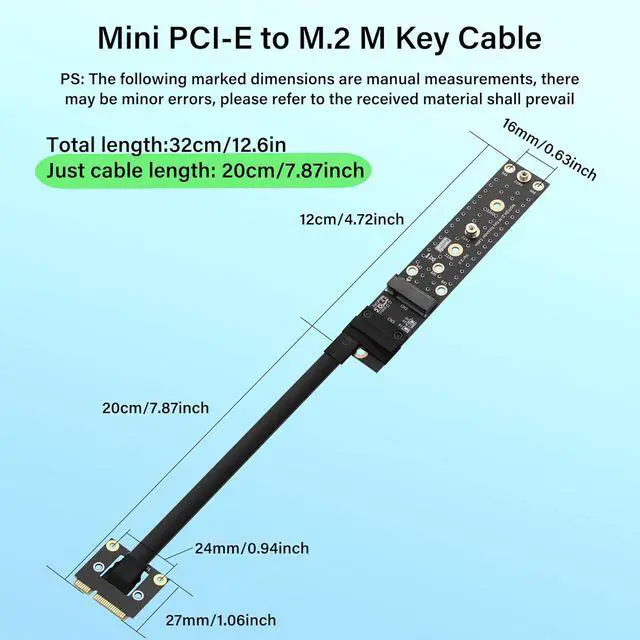 FunctionMini PCIE to NGFF M.2 M Key Extender Cable can be used to extend the transfer of the M.2 NVME SSD to the MINI PCIE port on the mainboard