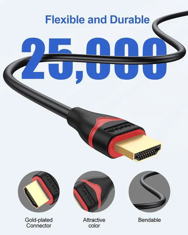 Newest Design to HDMI 2.1 Cable8K hdmi cord upgrade color matching design in red. This cable adopts 24k gold-plated hdmi plug, 30AWG copper wire with upgraded smart chip to ensure stable and accurate signal transmission. Delivers top class picture and sound. The PVC upgraded heat resistance material can withstand more than 25,000+ bending tests also greatly extends its life