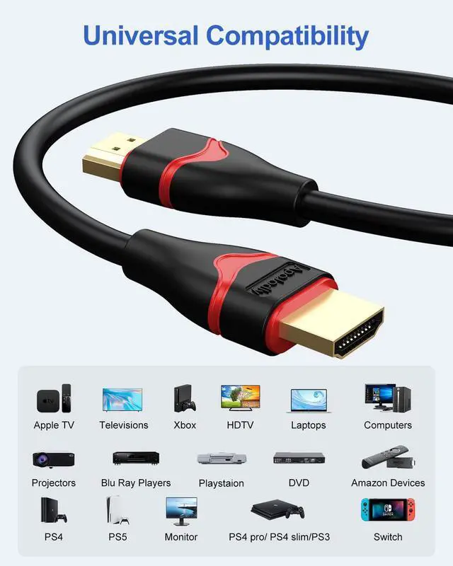 Ultra High Speed HDMI Cable for GamingConforms to the standard HDMI 2.1 version and has a transfer speed reached 48Gbps (6GB/s). High Speed 8K HDMI also achieve a super smooth picture of 4K@120HZ. It offers support for variable refresh rates for gaming enthusiasts, so that you can achieve smoother delay-free gaming and real-time interactive virtual reality. Compatible with all gaming devices PS5/PS4/PS3, Xbox series, Switch, etc