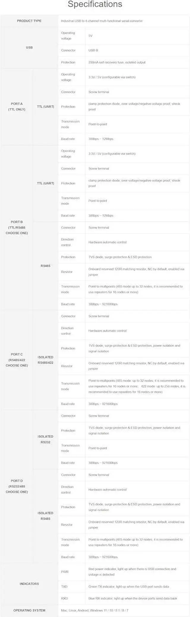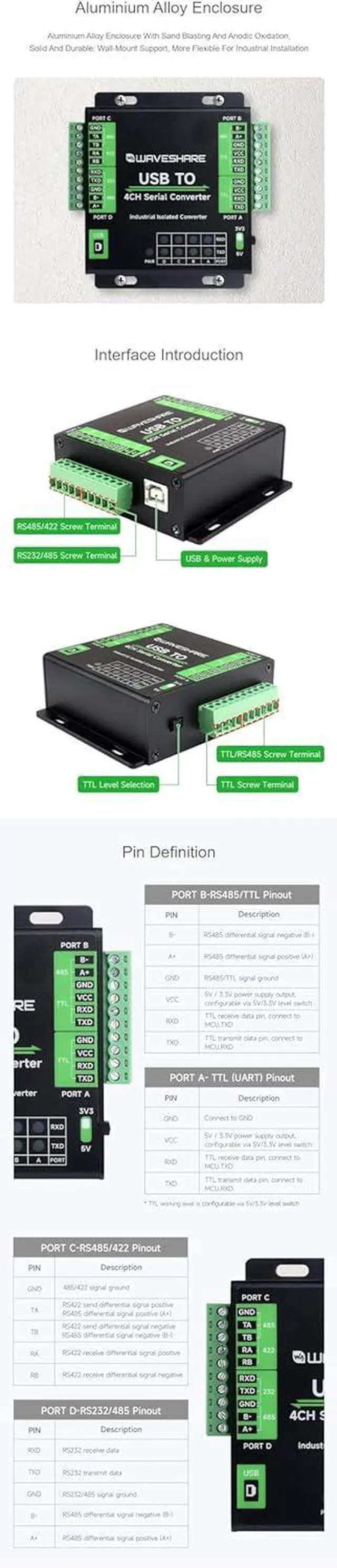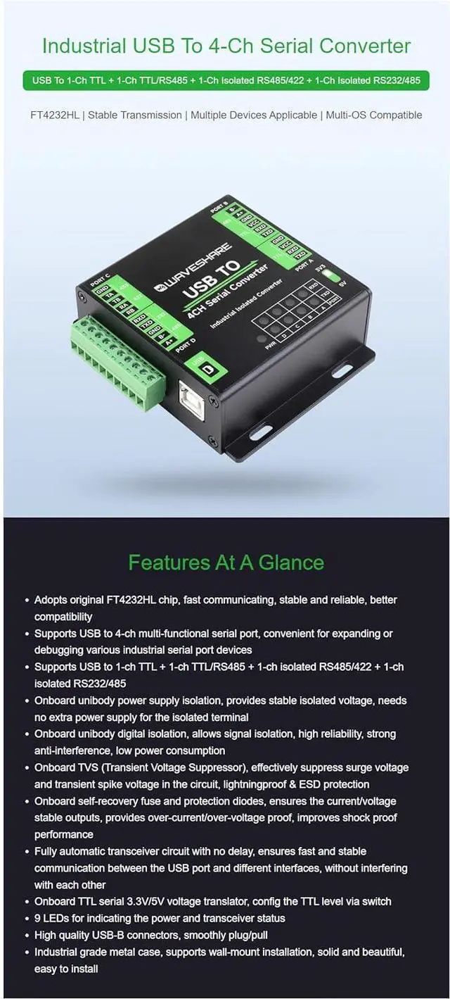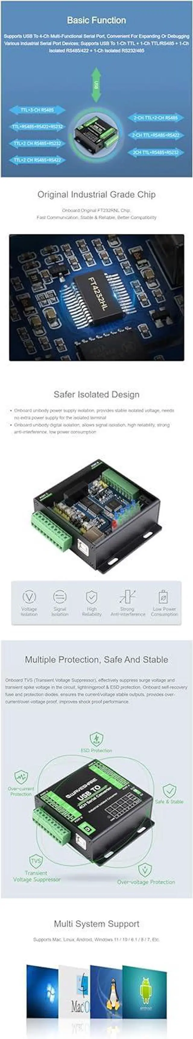 FT4232HL industrial converter, supports USB to 1-ch TTL + 1-ch TTL/RS485 + 1-ch isolated RS485/422 + 1-ch isolated RS232/485