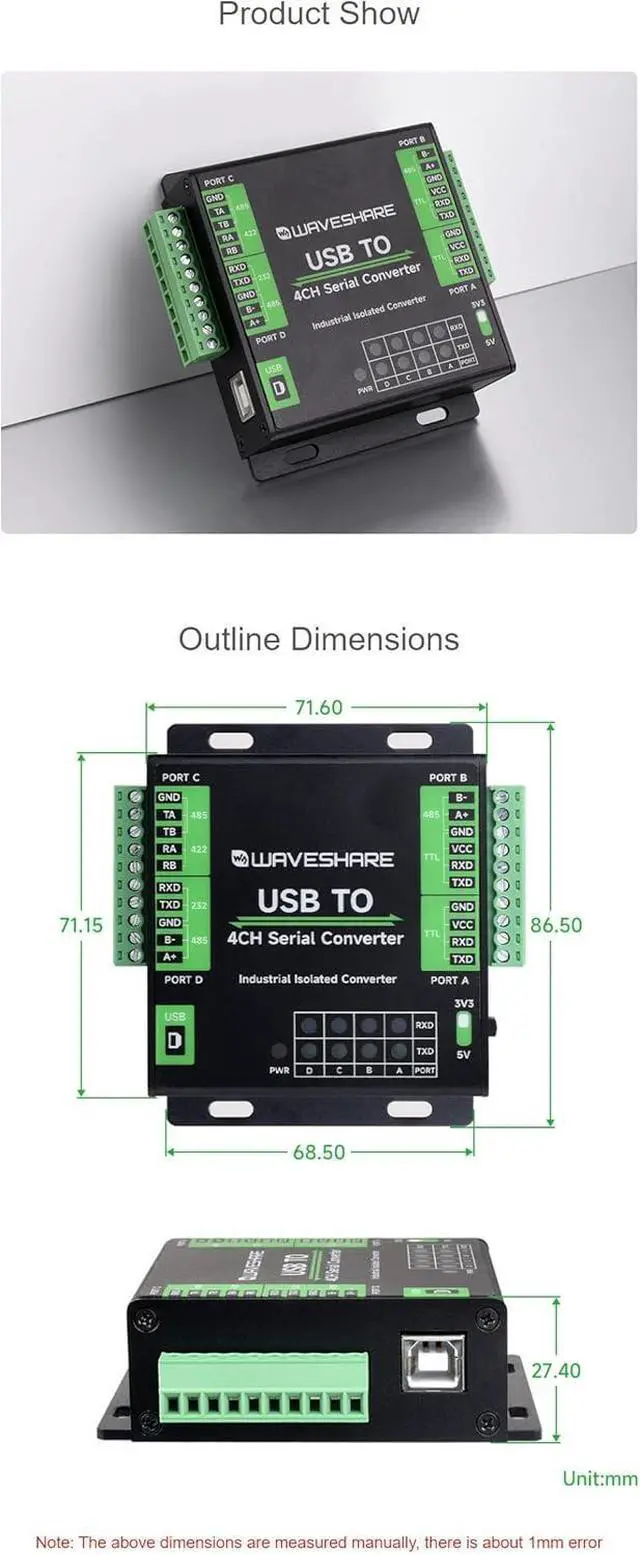 USB converter, onboard unibody power supply isolation, provides stable isolated voltage, needs no extra power supply for the isolated terminal