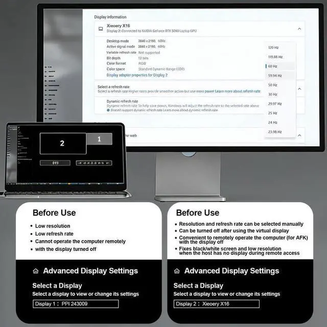 Default 4K Resolution for Stable Initialization Provides a default virtual display of 3840×2160 @ 60Hz, ensuring reliable graphics initialization and preventing resolution fallback, GPU downclocking or black screens.