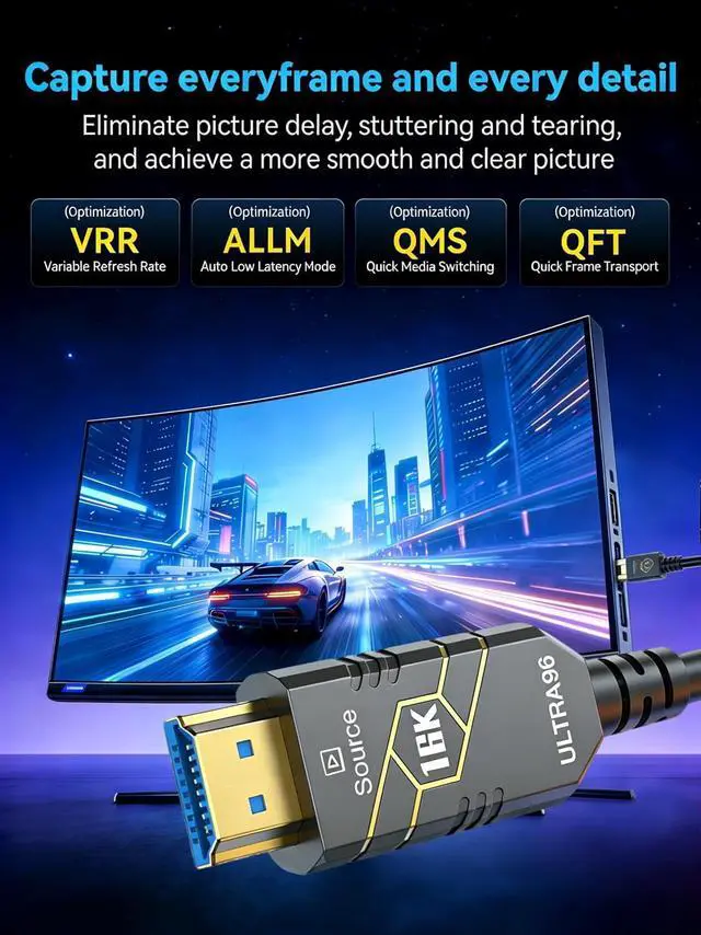2. 96Gbps ultra high speed HDMI fiber optic cable can be up to 300 feet long with zero attenuation , the latest HDMI 2.2 features. Support HDR, HDCP 2.2 & 2.3, Dynamic HDR, eARC, 3D video display. HDMI 2.2 cable is widely compatible with all 16K/8K/4K TVs on the market, OLED TV, UHD TV, CD, DVD, Projector, laptop and HDMI-enabled devices.