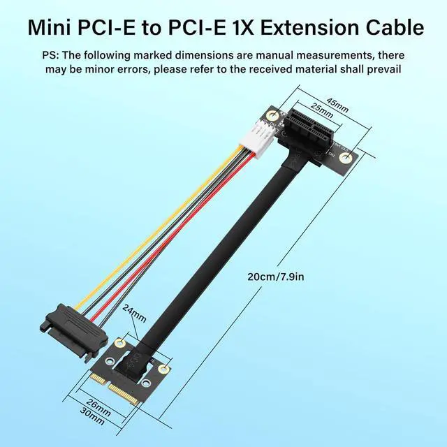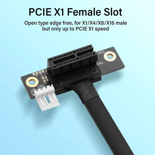 FunctionMini PCIE to PCIe X1 Extender Cable can convert the Mini PCIE slot on the motherboard into the PCIe X1 slot, which is used to connect various PCIe X1 devices such as graphics cards, and can also supports PCIe X16, X8, and X4 devices, but the actual data transfer speed depends on the speed of the Mini PCIE interface