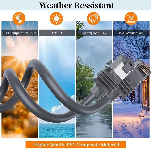 All-Weather Durability:Waterproof IPX6 rating and double-layer PVC shielding withstand rain, snow, and extreme temperatures (-40°F to 185°F). weatherproof outdoor cableIncludes dustproof caps to protect connectors