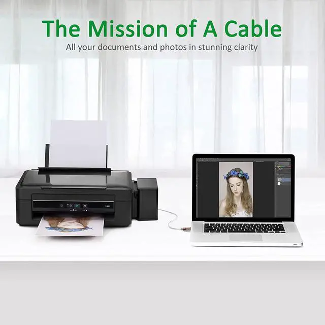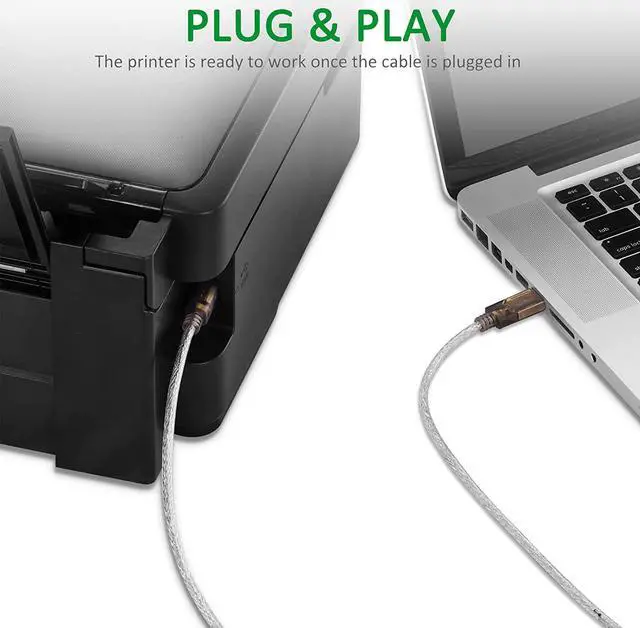USB A Male to B Male cable connects PC to a printer, scanner, printer switch hub, KVM Switch, and more with a square USB B port.
