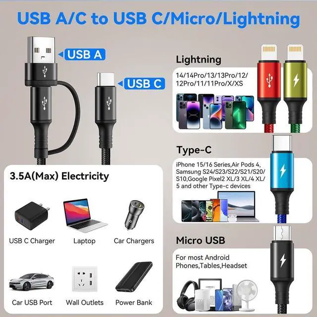 Universal Compatibility: Compatible with iPhone 16 15 14 Plus/ 16 15 14 13 12 11 Pro Max/ 16 15 14 13 12 11 Pro/ 14 13 12 Mini/ SE/ 16 15 14 13 12 11/ XS / XS Max/ XR/ 8/ 8 Plus/ 7/ 7 Plus, Phone 6s/ 6s Plus/ 5/ 5s/ SE, iPads, Pad 4, Pad Air, Pad mini, Pod. USB type c connector supports to the Samsung Galaxy UItra/ S24+/ S24/ S23/ S22+/ S22/ S21+/ S21/ S20+/ S20/ 210+/ S10/ S9+/ S9/ S8+/ S8, Note 9/ 10/ 20, Nexus 5X, Nexus 6P, LG V30 V20 G6 G5, Pixel/ Pixel 2 XL, HTC, ZUK Z1, Lumia 950, Lumia 950 XL, N1. Micro USB port for Samsung Galaxy S7/ S6/ S5 most Android phones, Kindle, tablets, Bluetooth headset, external batteries, PS 4 5 controllers and more.