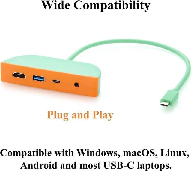 4-in-1 USB C Expansion Hub This 4-in-1 USB-C hub expands one USB-C port into HDMI, USB-C data, USB-A data, and 3.5mm audio output. No driver required, plug and play. Compatible with Windows, macOS, Linux, Android and most USB-C laptops.