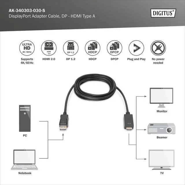 Connects PC/computer, laptop, notebook or graphics card for gaming to HDMI-enabled devices such as TV, screen, monitor, projector/projector, display
