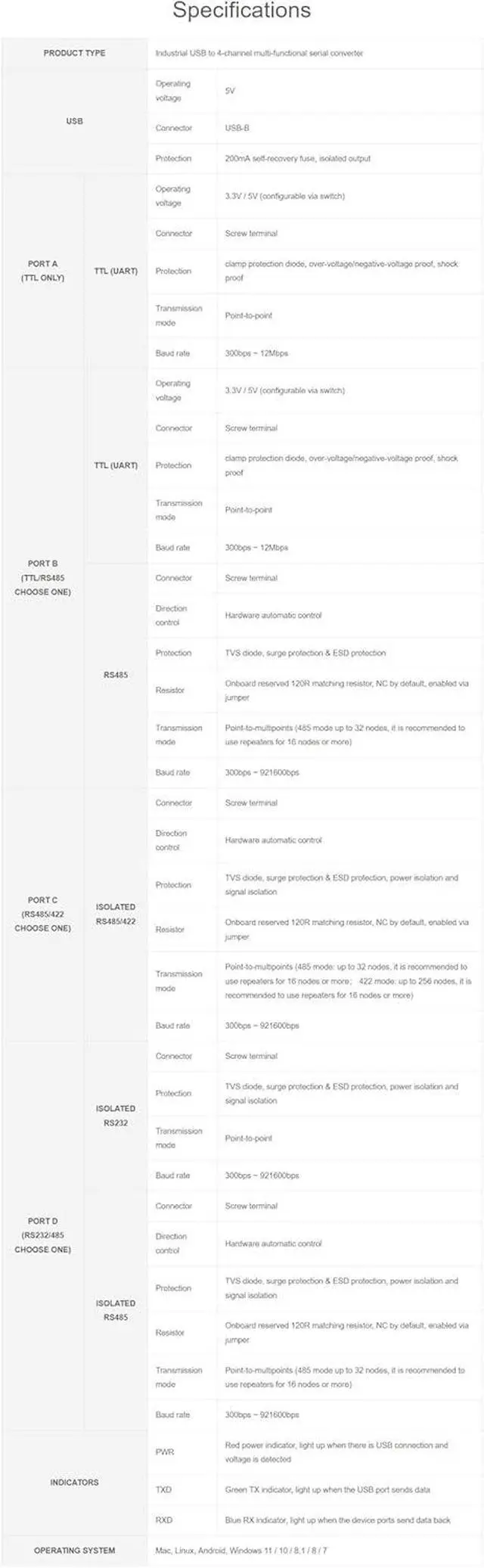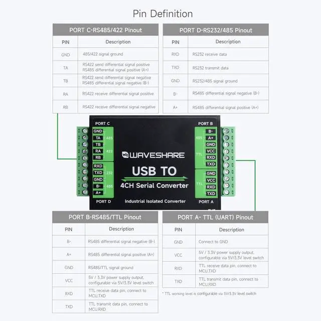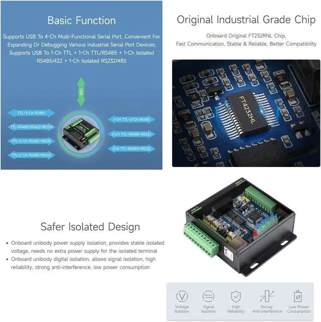 Supports USB to 1-ch TTL + 1-ch TTL/RS485 + 1-ch isolated RS485/422 + 1-ch isolated RS232/485. Onboard unibody power supply isolation, provides stable isolated voltage, needs no extra power supply for the isolated terminal