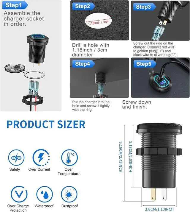 Easy Installation: Installing our 12V USB socket is straightforward! Simply drill a 1 1/8-inch diameter hole with a standard drill bit, insert the product, and tighten the screw ring. Connect the product's positive terminal to the power source's positive terminal and the negative terminal to the power source's negative terminal or forced ground terminal to begin charging. We include 18AWG red and black wires with a 15A fuse, covering most installation needs.