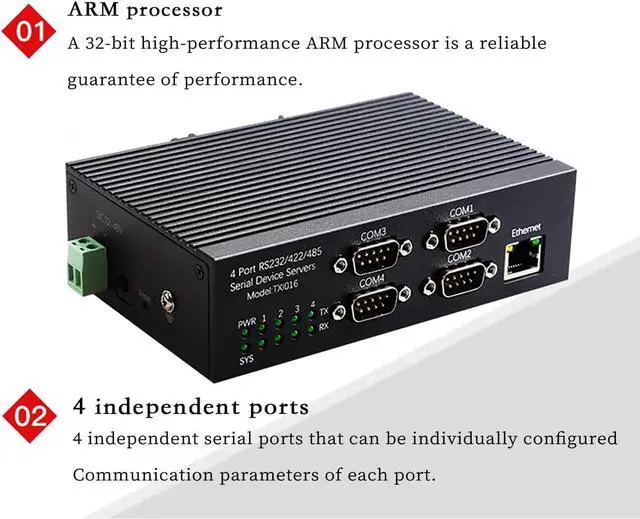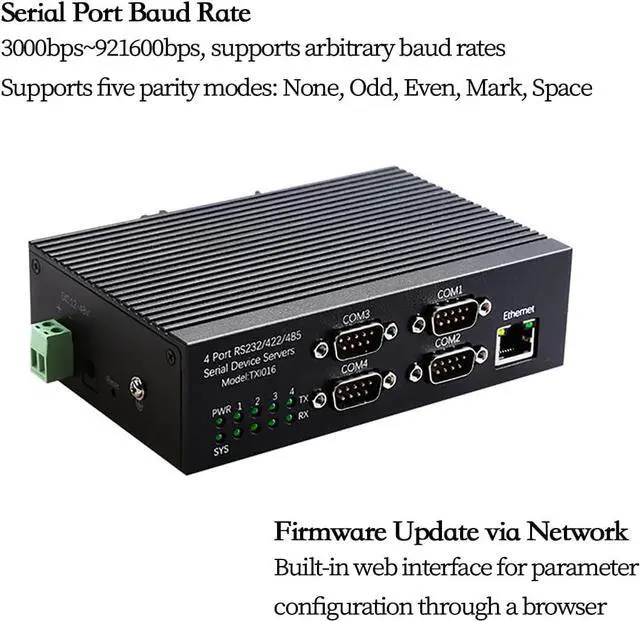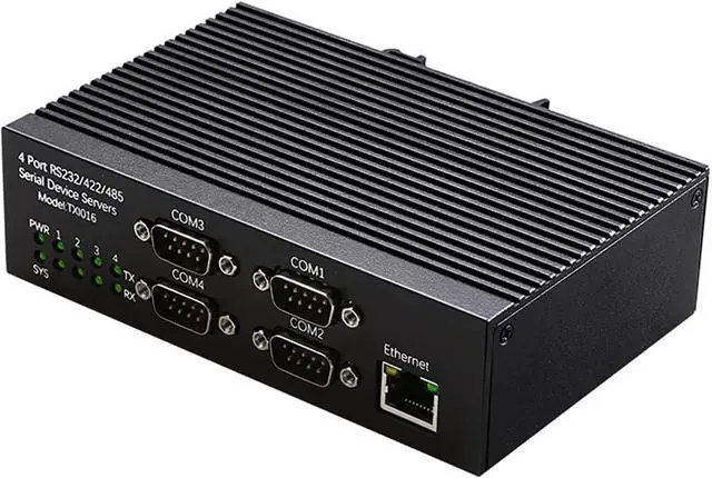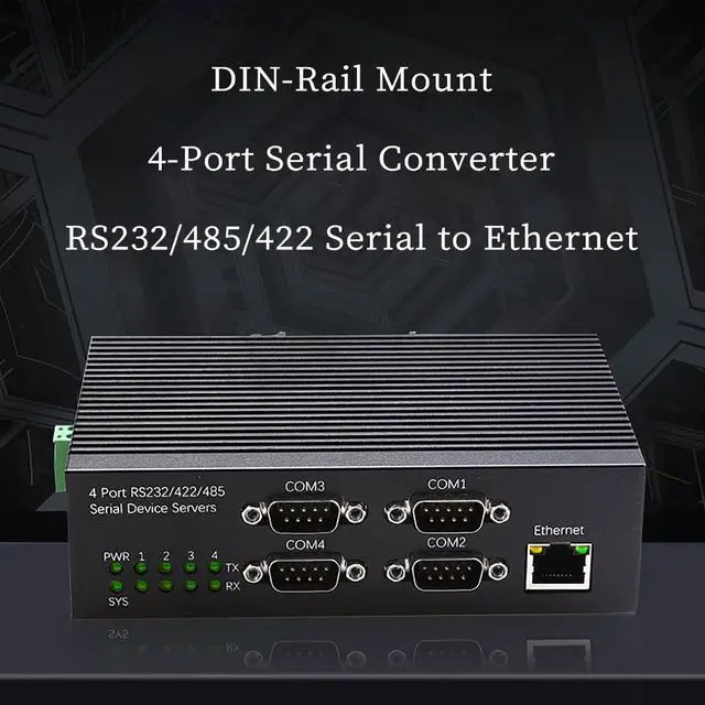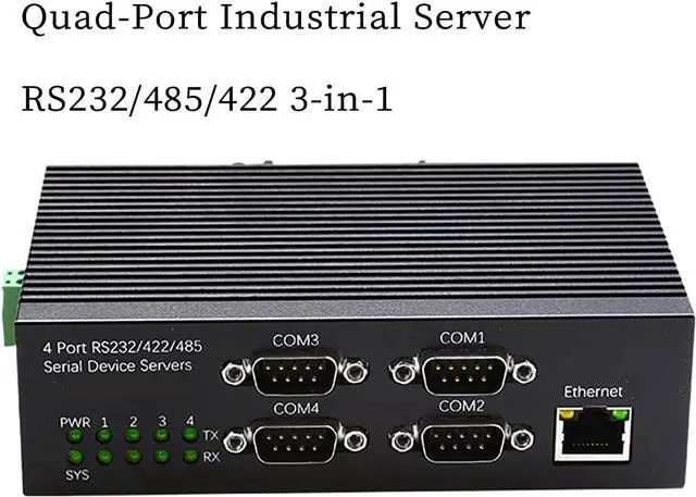 4 Port RS485 RS232 RS422 Serial to Ethernet Server -- This industrial serial device server provides four independent UART ports supporting RS232 RS485 and RS422 communication allowing seamless conversion between serial devices and Ethernet networks for PLC automation industrial monitoring and remote control.