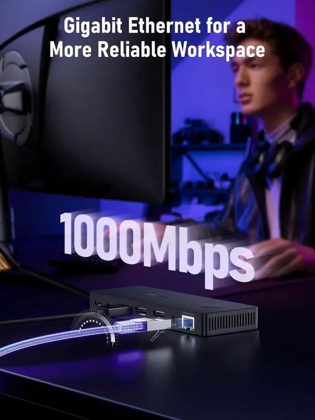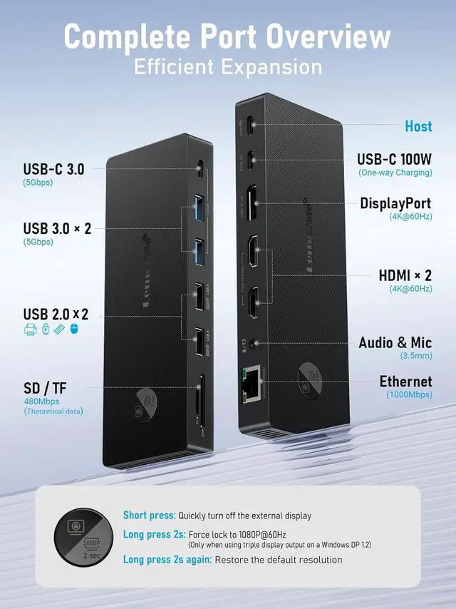 Triple Display & 4K@60Hz VisualsBoost productivity with triple display support via Dual HDMI and DP 1.2. Enjoy smooth 4K@60Hz visuals on single/dual monitor setupsperfect for video editing and high-definition streaming. Important: For triple-monitor 4K@30Hz output, your laptop must support USB-C DP 1.4 and DSC (Display Stream Compression); without this, the default stable resolution is 1080P@60Hz