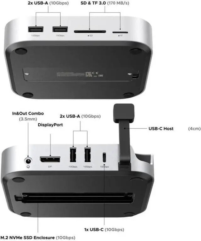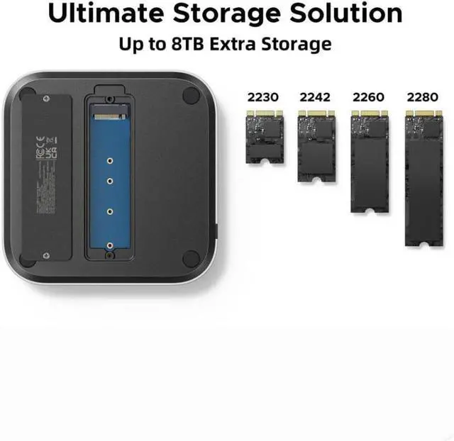 Docking Station USB HUB Type-C to DP 4K240Hz M.2 NVMe SSD Slot 10Gbps USB-A Splitter SD&TF 3.5MM for M4/M4 Pro M.2 NVMe SSD slot supports up to 8TB storage DisplayPort 1.4 output supports 4K resolution at 240Hz; 4K 240Hz supported only on M4 Pro, with backward compatibility for 4K144Hz, 4K120Hz, 4K60Hz, 2K240Hz, 2K144Hz, 2K120Hz, 2K60Hz, 1080p240Hz, 1080p120Hz, 1080p60Hz, 720p, and 480p Dual monitor display via HDMI port and DisplayPort 10Gbps data transfer speed across four USB-A 3.2 ports and one USB-C 3.2 port SD and TF card slots support simultaneous read/write operations with speeds up to 170MB/s Designed specifically for M4 and M4 Pro devices Grooved bottom design allows easy activation without moving the device Curved form factor avoids blocking device cooling vents Triple security protection for expansion Includes M.2 NVMe SSD installation steps Package includes docking station This product is a third-party replacement.Any use of brand names or model designations is purely to indicate compatibility.