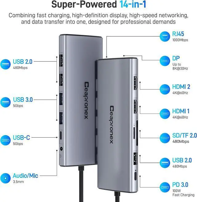 14 in 1 USB C Hub USB C Docking Station for LaptopTransform your laptop with this usb c displaylink docking station dual monitor featuring dual Monitor 4K HDMI, DP Display port (8K@30Hz), Gigabit Ethernet port, 2 USB 3.0 ports, 3 USB 2.0 ports, USB C Power Charging Port (max 100W), USB C Data Transfer port(5Gbps), SD/TF card readers and 3.5mm Mic/audio. Suitable for home and office use for effective work