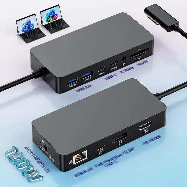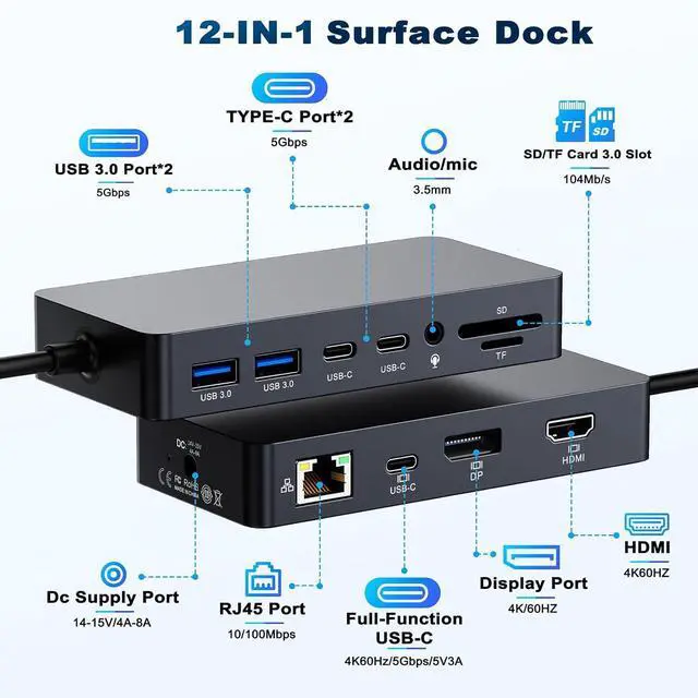 12-IN-1 MS Surface Pro Docking Station MS Surface dock Equipped with Surface Connection technology to offers 12 options for Enhanced Productivity. Upgraded Surface Docking Station design with HDMI*4K@60Hz, DP*4K@60Hz, Full-function Type-C female socket support: 4K@60HZ video expansion + 5Gbps Data + 5V3A fast charging 3 -in-1; The Surface pro docking station also equip 100Mbps RJ45 Ethernet port, 2x USB C 3.0 data port, 2x USB A 3.0 Data Ports, SD+TF cards slot, 3.5mm audio Port, 120W DC Power Port and 120W surface Power Adapter charger, Surface dock With simple plug and play connectivity.