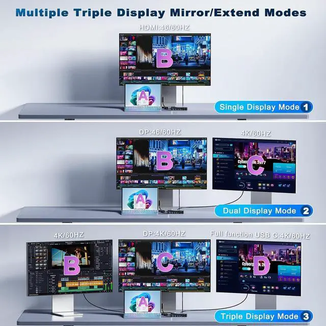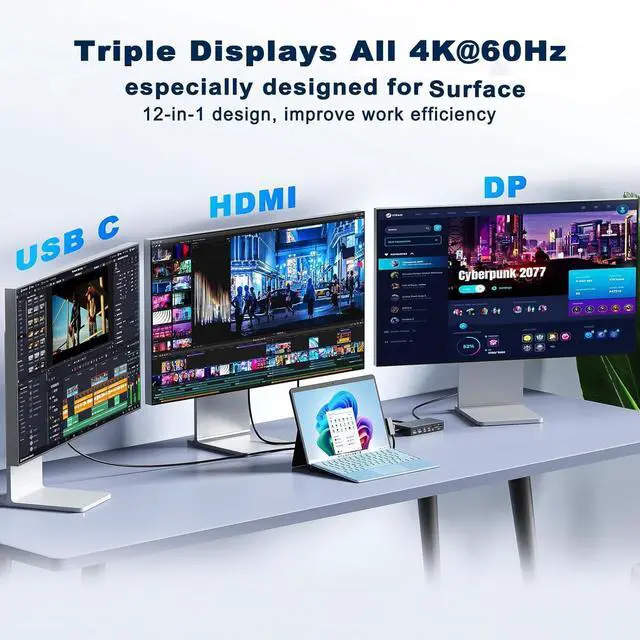 4K/60HZ Triple Display Output Surface Dock HubMS Surface Triple Displays Dock(HDMI+DP+Thunderbolt USB-C) with extend or mirror mode, Boost your efficiency 3 times.Enjoy MST (Multiple Stream Transport) functionality for efficient multitasking with up to three screens simultaneously. Whether you need to duplicate or expand your screen. Whether display one screen or 3 screen,the MS Surface docking station will always ensures an 6K@60HZ exceptional viewing experience.