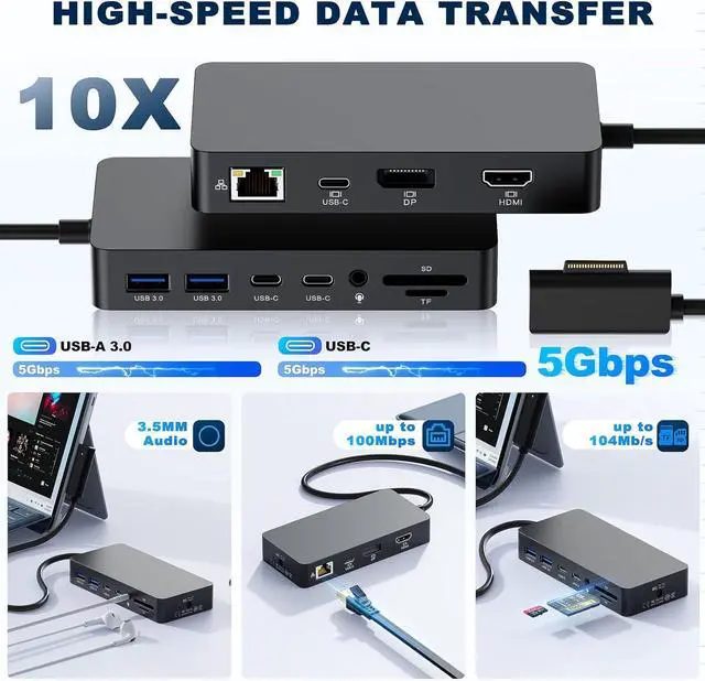 Super Speed Data Transfer Surface Docking StationThis Surface Pro docking station comes with 2 * USB A 3.0(5Gbps) and 3 * USB C data (5Gbps) ports for seamless data transfer,allows you to connect keyboard,mouse,USB flash driver,USB C hard disks,etc;Extra SD TF 3.0 slot up to 104mb/S , UHS-I, maximum support 2TB, support two cards to read at the same time. no need to carry sd reader.
