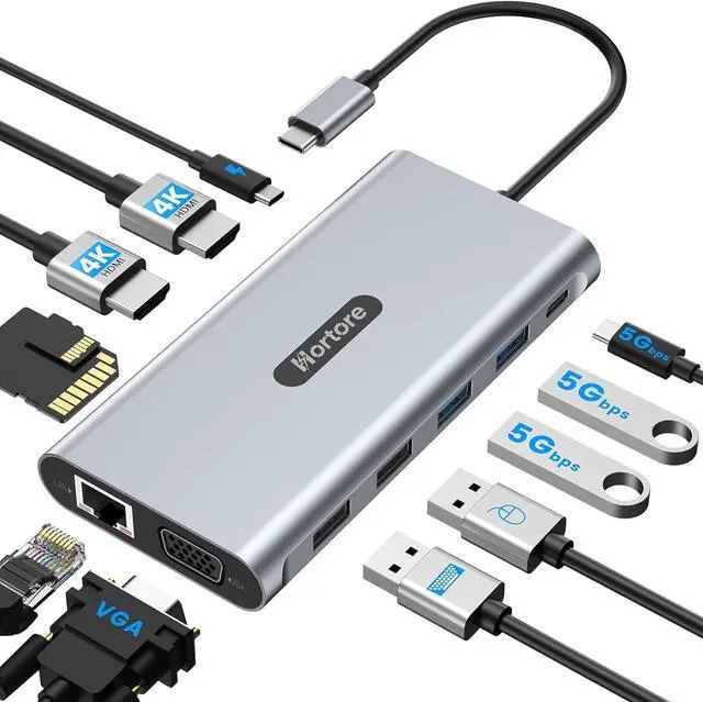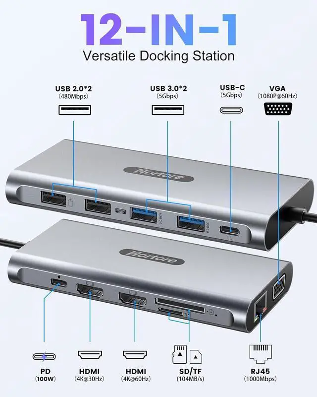 12-in-1 USB C Docking StationOne cable, seamless connectivity. This USB-C hub multiport adapter expands a single USB-C port into 2× HDMI, VGA, RJ45 Ethernet, 100W USB-C PD, USB-C data port, 2× USB 3.0, 2× USB 2.0, and an SD/TF card readeran all-in-one laptop docking station designed for daily productivity.