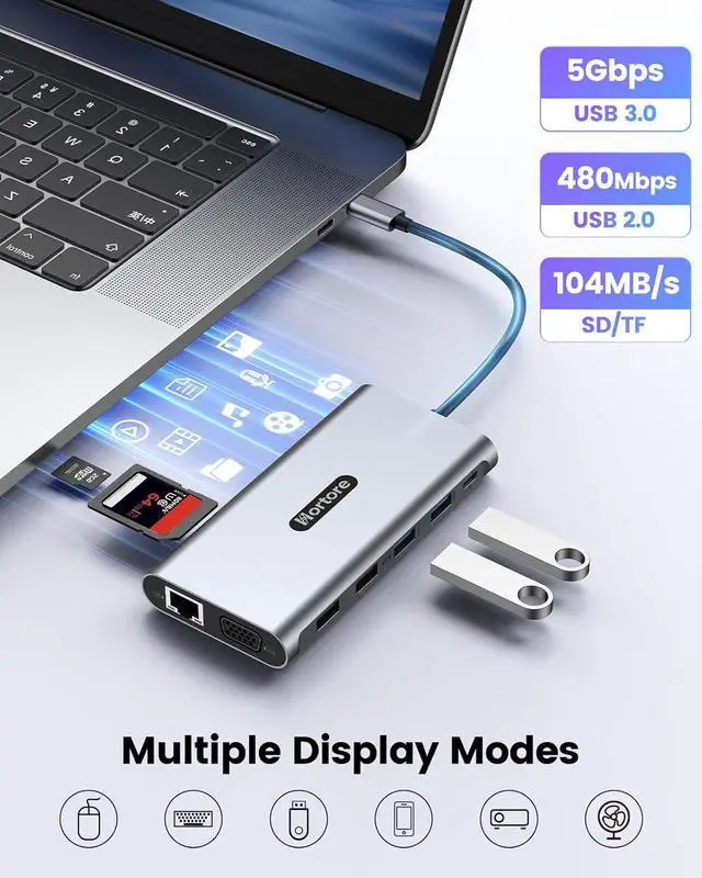 High-Speed Data TransferThe built-in USB hub features USB 3.0 ports (up to 5Gbps) for fast file transfers, USB 2.0 ports (480Mbps) for stable peripherals such as keyboards and mice, and an SD/TF card reader (up to 104MB/s) for quick photo and video access.
