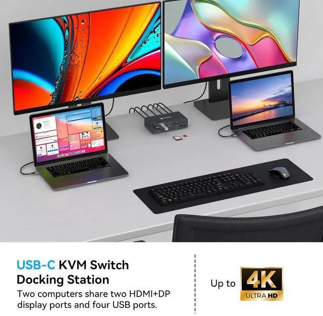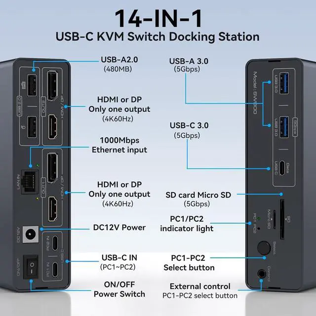 KVM Switch 2 Montors 2 ComputersThe laptop kvm switch 2 monitors not only allows you to easily manage and switch between two computers with just one set of keyboard and mouse while simultaneously controlling two monitors,but also share a 14 in 1 Docking Station, including 2 USBA 3.0 DatePort; 1 USBC DatePort; Displayports; HDMI port; gigabit ethernet port; Micro SD/SD card slot, etc.; The dual monitor KVM switch is ideal for both professional and home office setups. Note: The Displaylink driver must be installed when using the USB C KVM switch docking station, otherwise monitors will not output images properly