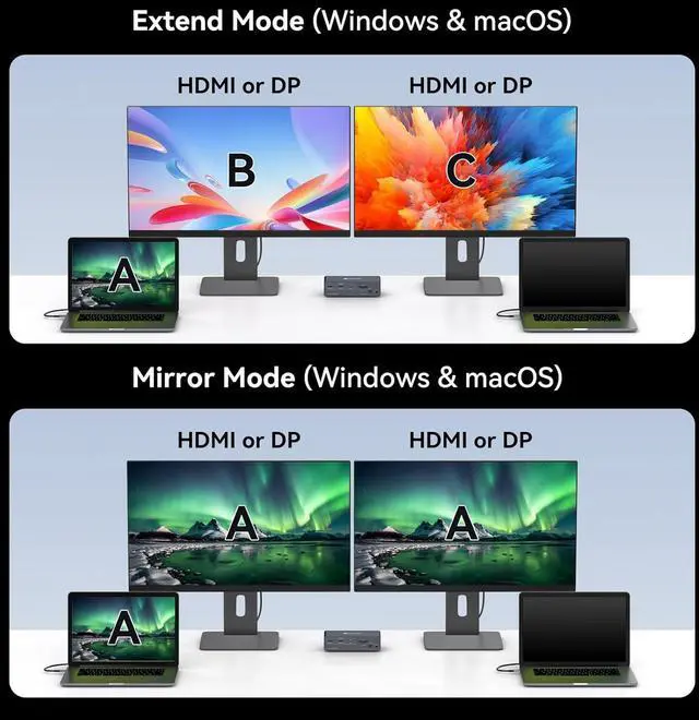 Mirroring and Extended DisplayThe KVM switch 2 monitors 2 computers supports extended mode and mirroring mode, suitable for desktop/laptop computers (Windows systems support MST technology). Two monitors can be set to extended display or mirroring display, the monitors can display the same or different images. This KVM switches breaks through the limitations of the Mac OS system and can achieve extended mode for two monitors under the Mac OS system, i.e., two monitors can be set to extended display or mirroring display, and the monitors can display the same or different images(including M1, M2, M3, M4 chipsets like MacBook, MacBook Air/Pro, and Mac Mini)