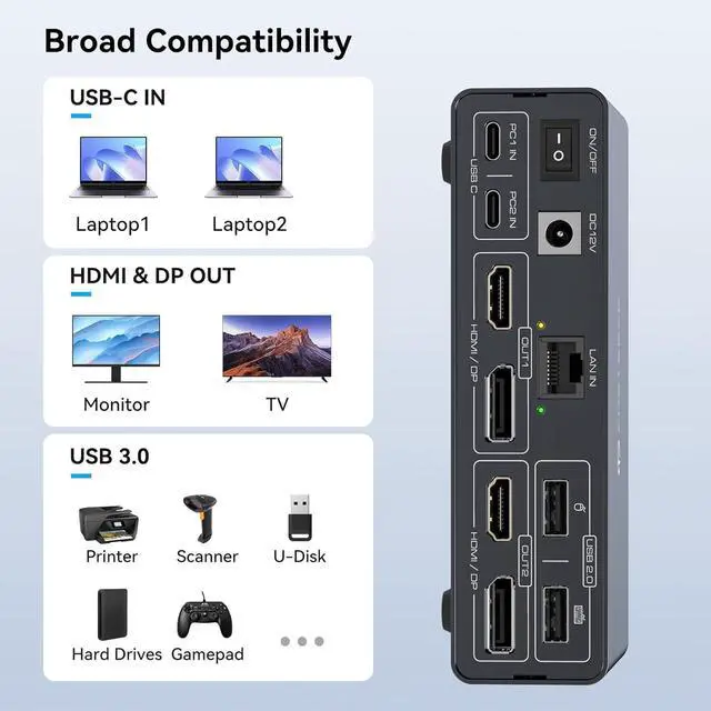 Wide CompatibilityThe USB C KVM switch is equipped with HDMI and DisplayPort interfaces, enabling seamless connection to a variety of displays, including models that support HDMI, DisplayPort and DVI inputs. Note: A HDMI-to-DVI cable is required to connect to a DVI display (not included). Compatible with multiple systems, seamlessly compatible with macOS, Windows, Chrome OS, Linux, and Android devices. Note that your device must be equipped with a USB-C 3.2 (or higher) interface