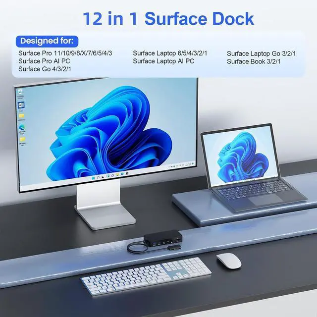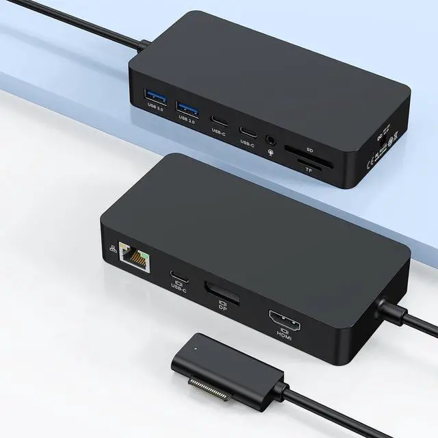 12-IN-1 Surface Docking StationThe 12-in-1 tripe display surface dock with simple plug and play connectivity, built to boost your productivity. The MS Surface Travel Hub uses popular surface connection technology, giving you an incredible range of functions. 12-in-1 Surface Pro dock equips with 4K@60HZ HDMI ports, 4K@60HZ DP port, USB C Thunderbolt 4 port(4K@60HZK Display+5Gbps Data+5V/3A PD), Gigabit RJ45 port, 2x USB C Data port, 2x USB 3.0 Ports, SD/Micro SD 3.0 card, 120W DC Power Supply.