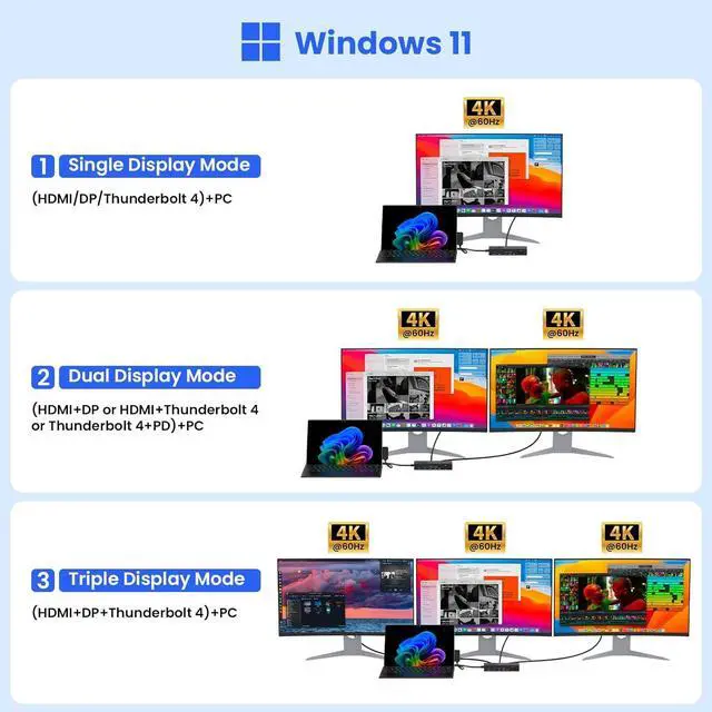 4K@60HZ Triple Display Surface DockSurface Dock triple display(HDMI+DP+full-function USB C) support Extend Or Mirror Mode. Surface dock 2 connect up to three 4K@60HZ monitors and enjoy stunning visuals and crystal-clear display quality that will elevate your work and entertainment experience. Note: For Windows 10 and below, When you need to connect 3 monitors, you need to turn off the Surface screen.
