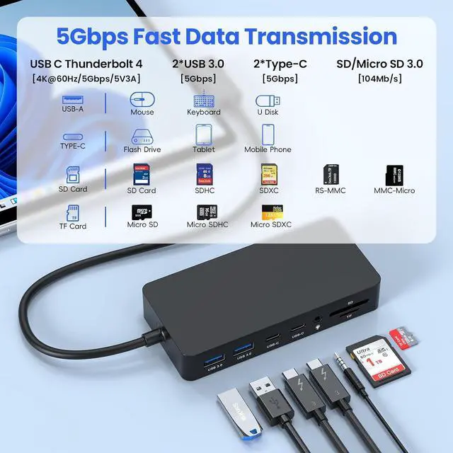 Ultra-High Speed Data TransferSurface Pro 11 USB Hub comes with latest full-function USB C port(4K@60Hz Video Output+5V/3A Charge+5Gbps Data Transfer). Surface Pro Docking Station multiport adapter offers 2x USB C and 2x USB 3.0 ports for fast transmission up to 5Gbps. It takes only a few seconds to transfer photos or videos to your laptop. TF/SD 3.0 Card Reader data transfer up to 480Mbps. Surface dock station perfect for connecting the USB peripherals such as flash drive, hard drive, keyboard, mouse, printer and more.