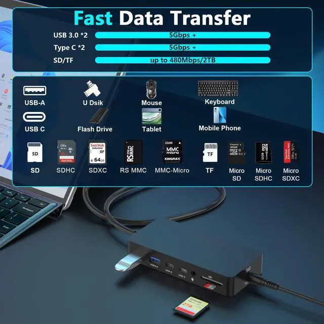 Ultra-Fast Data Transfer & Charging: The docking station equipped with 2 USB 3.0 and 2 USB-C ports, offering transfer speeds up to 5Gbps. Quickly move large files, connect external drives, and sync devices in seconds. The SD/TF card slots support up to 2TB capacity and 480Mbps speed. Plus, the DC power input supports max 72W for stable charging and uninterrupted performance (Please connect the power adapter during use.)