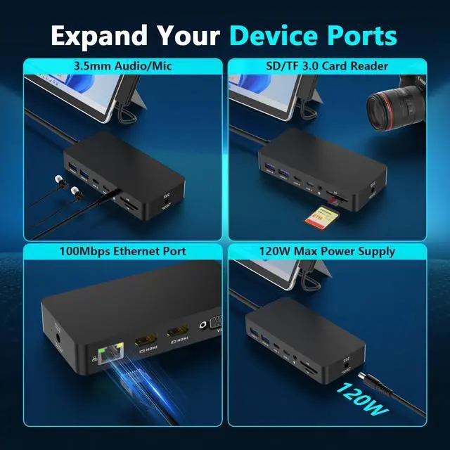 12 IN 1 Versatile Docking Station - Transform your device into a powerful workstation with this 12-in-1 Surface Dock. Featuring dual 4K HDMI ports, VGA, USB 3.0, dual USB-C, RJ45 Ethernet, SD/TF card readers, 3.5mm audio jack, and a DC power input, this hub simplifies your workspace and eliminates the need for multiple adapters. Perfect for multitasking, data transfer, and media display