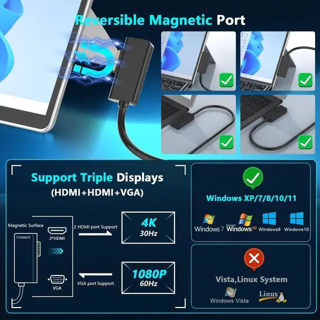 Magnetic Connector & Broad Compatibility: The surface dock built with a reversible magnetic connector for secure and effortless connection to Surface devices. Compatible with Surface Pro 11/10/9/8/X/7+/7/6/5/4/3, Surface Laptop 7/6/5/4/3/2/1, Surface Laptop Studio 2/1, Surface Laptop Go 3/2/1, Surface Go 4/3/2/1, Surface Book 3/2/1. Plug-and-play designno drivers required for wide usability