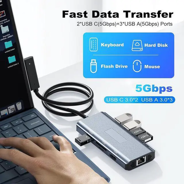 5Gbps High-Speed Data TransferThe Surface Pro dock features 3 USB 3.0 ports and 2 USB-C ports, supporting 5Gbps high-speed data transfer, significantly enhancing work efficiency. The Microsoft Surface laptop dock adopts a lightweight and compact design, and is equipped with SD and TF card slots, allowing easy access to files on standard SD and Micro SD storage cards, with support for reading two cards simultaneously