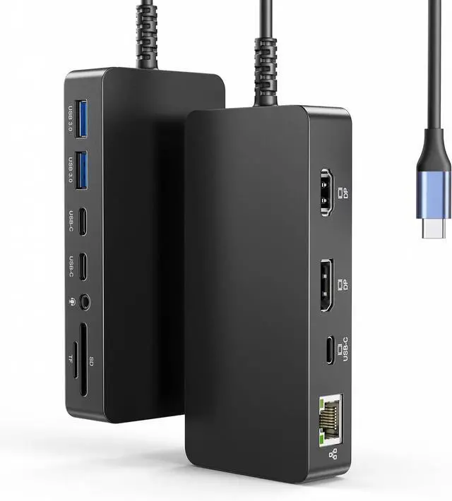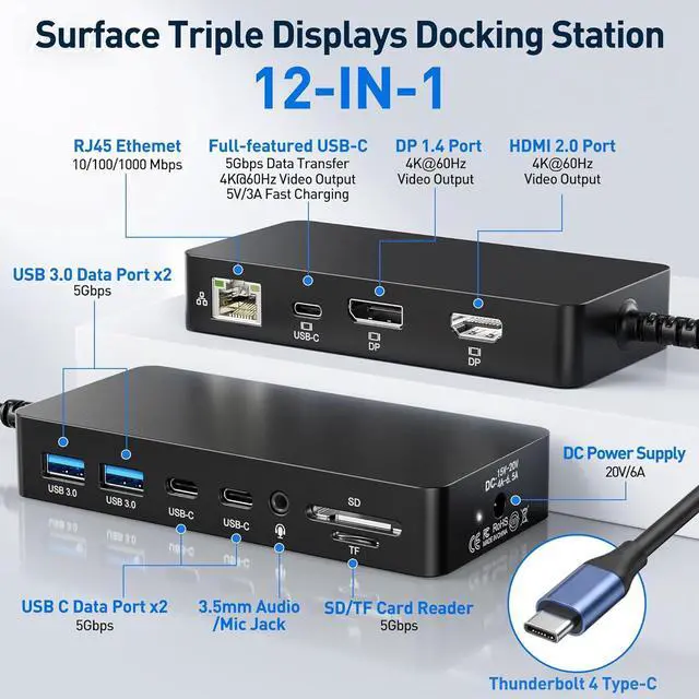 12-in-1 Thunderbolt 4 Dock: All the Ports You NeedExpand your Surface with a true 12-in-1 Thunderbolt 4 docking station. It features HDMI (4K@60Hz), DisplayPort (4K@60Hz), and a full-featured USB-C port (4K@60Hz, 5Gbps data, 5V/3A charging)all driven by Thunderbolt 4s high bandwidth. Also includes Gigabit Ethernet, 2x USB-C data ports, 2x USB-A 3.0 ports, SD/TF card slot, 3.5mm audio jack, and a 120W DC power input. Just plug and play, and enjoy seamless connectivity with your Surface Pro, Surface Book, Surface Go, and Surface Laptop.